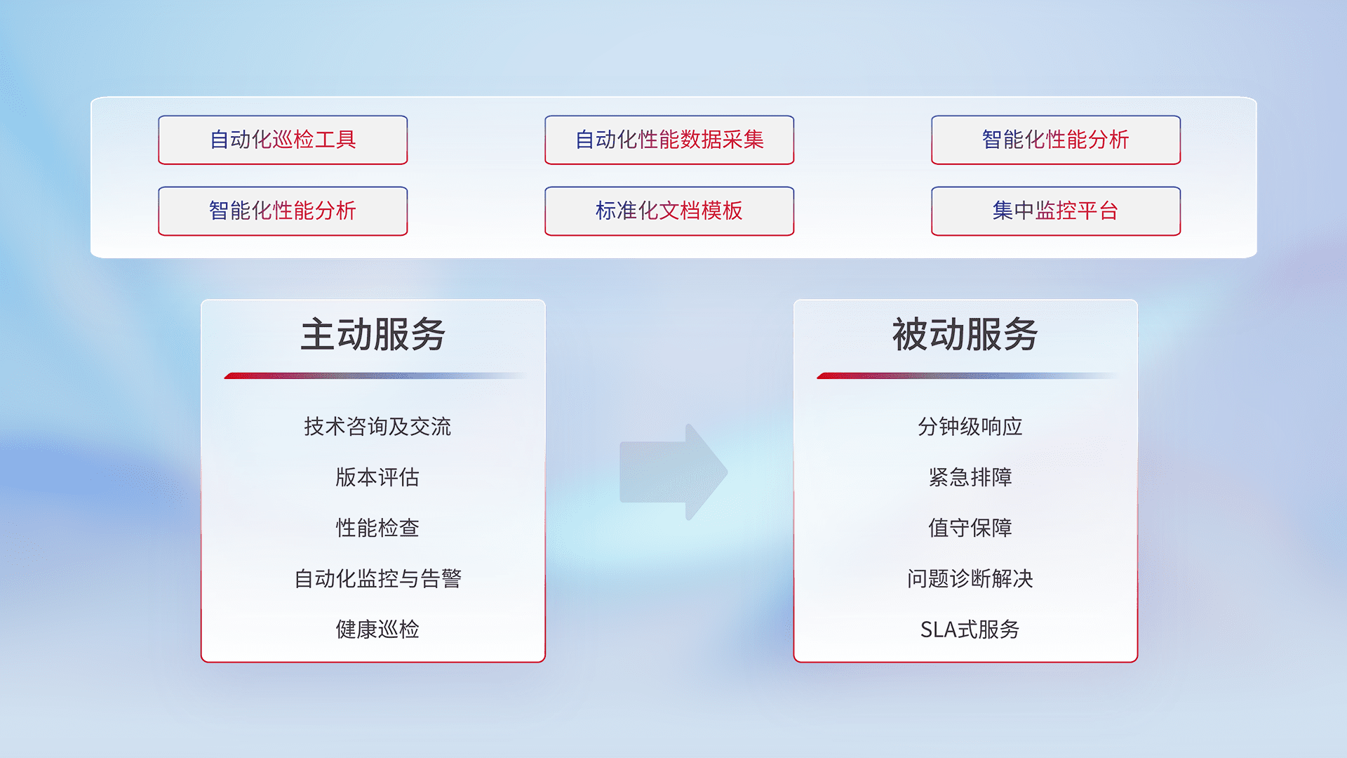 智能化工具和标准化文档,,,保障服务质量,,,提供主动服务(包含技术咨询、、、版本评估、、、、性能检查、、、自动化监控与告警、、、、健康巡检)和被动服务包含(分钟级响应、、、、紧急排障、、、值守保障、、、问题诊断解决、、、、SLA服务)。。。。